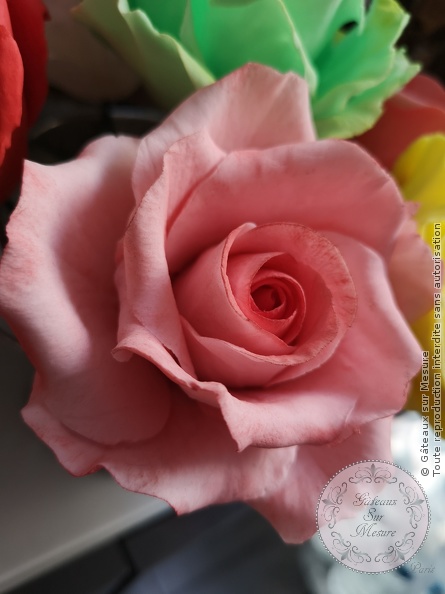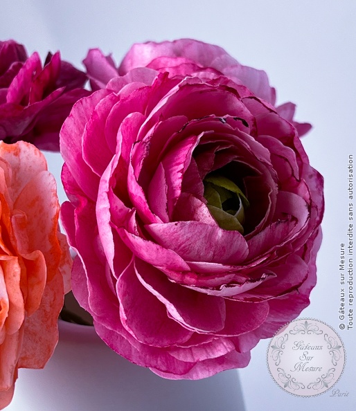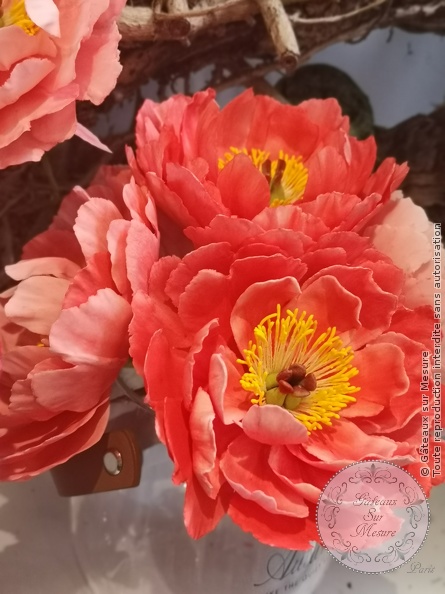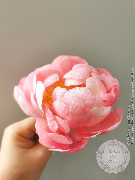Réalisation de fleurs en wafer paper (rose ou pivoine, renoncule, feuillage).
